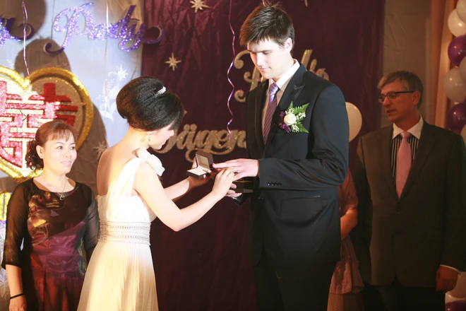 The ceremony itself consists of three parts: exchange of rings, cutting the cake and pouring the wine.